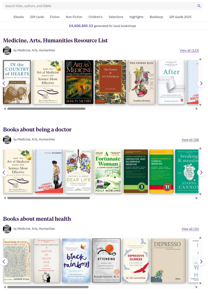 There are books about ‘being a doctor’, ‘mental health’, ‘medical humanities and art’, ‘graphic medicine’, ‘books for children’ and much, much more.